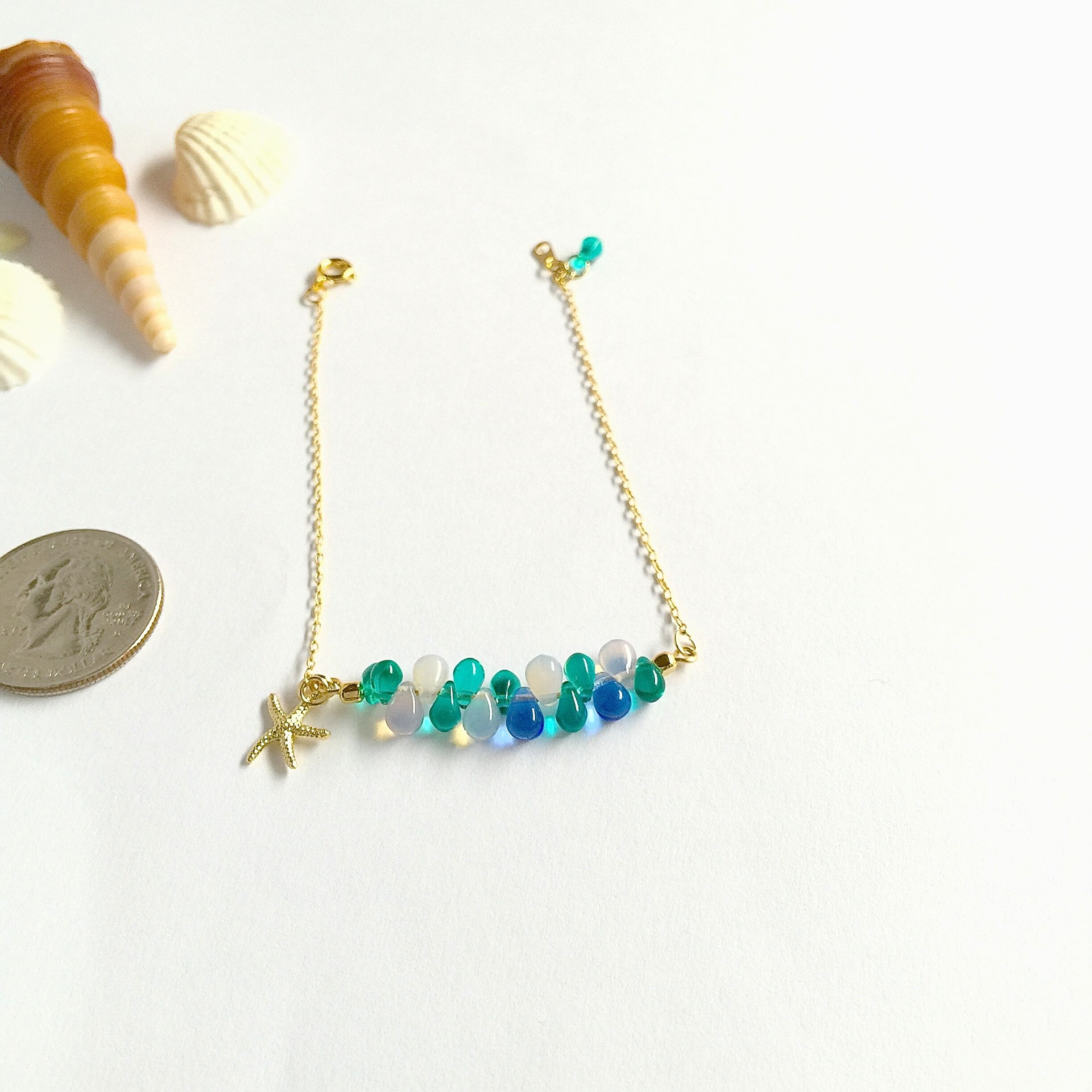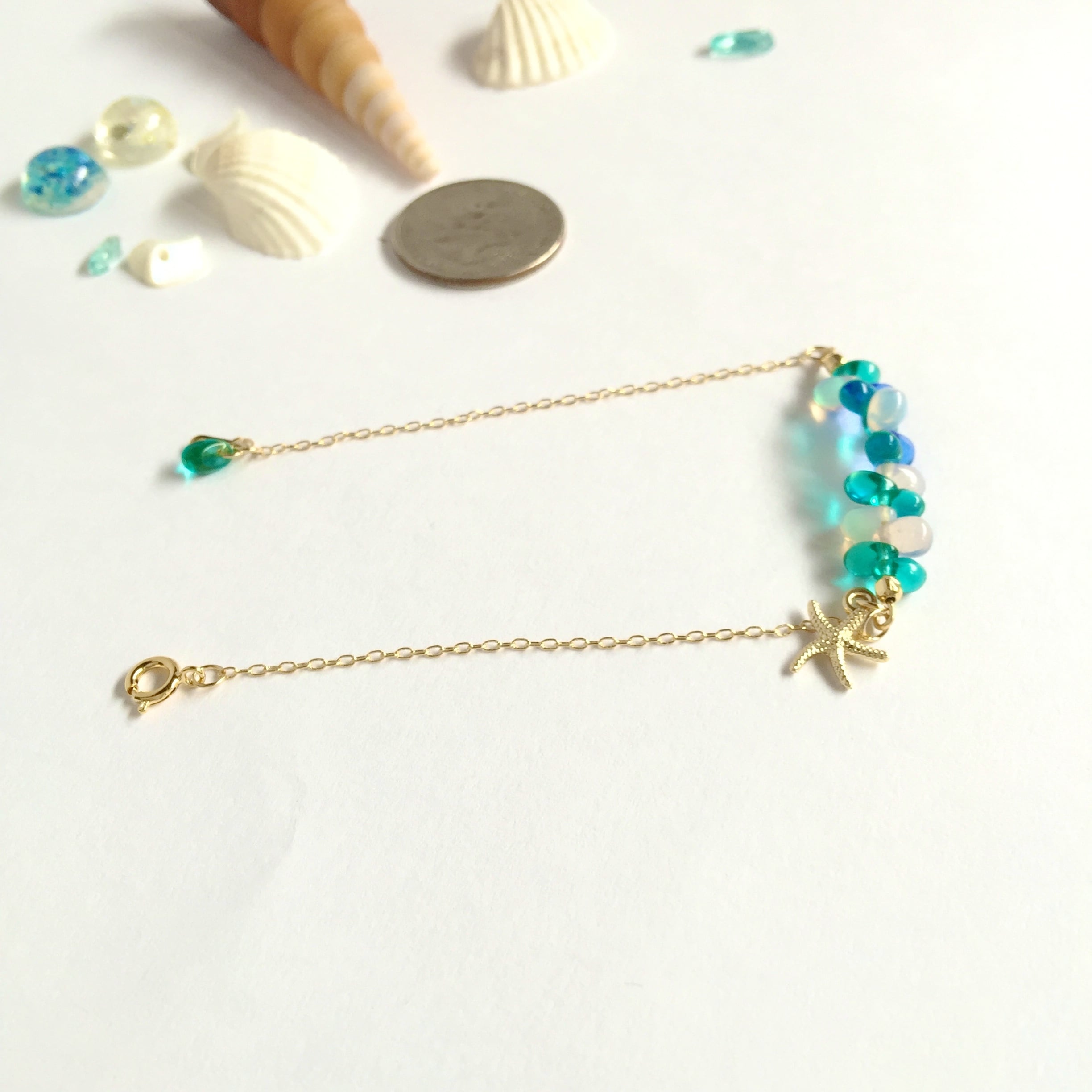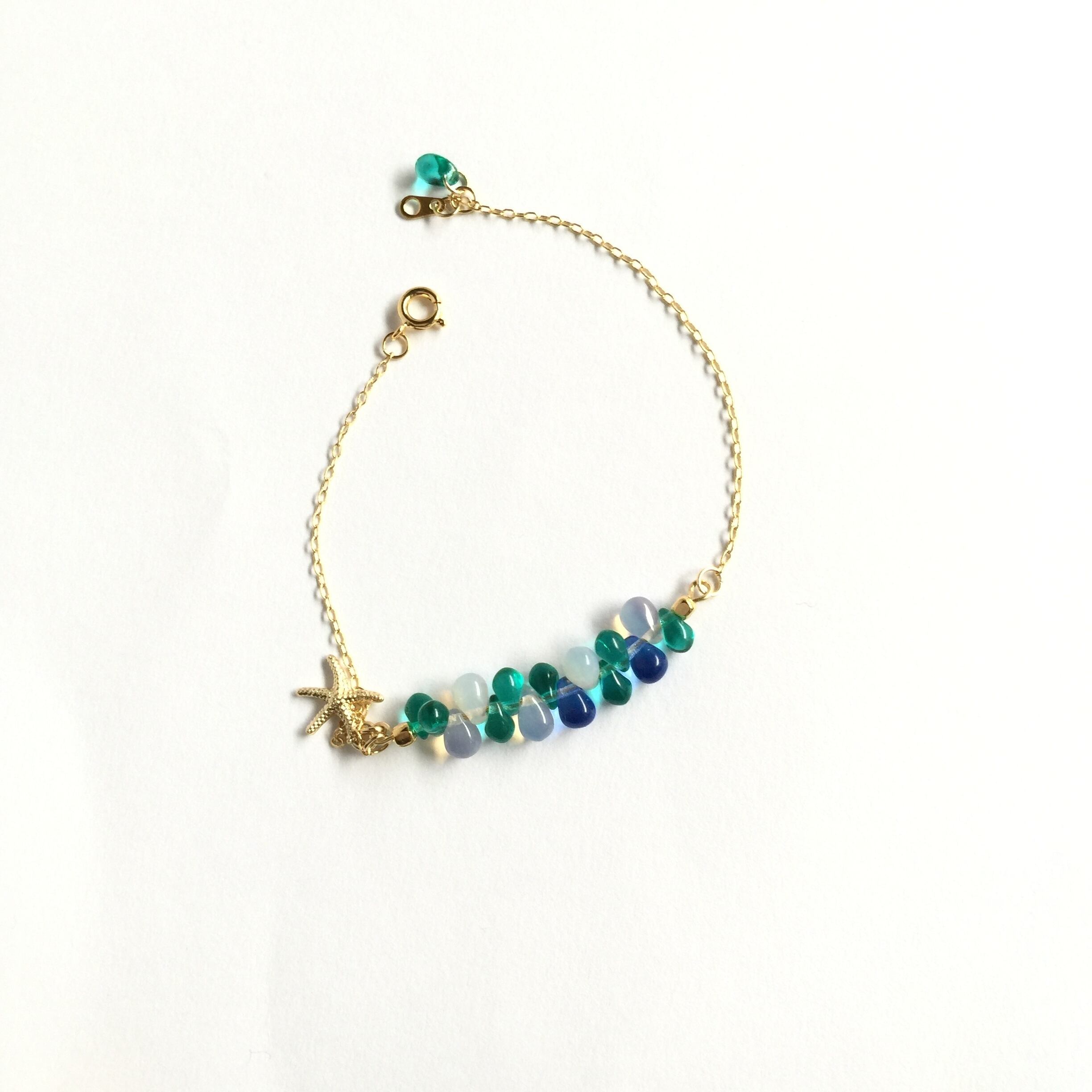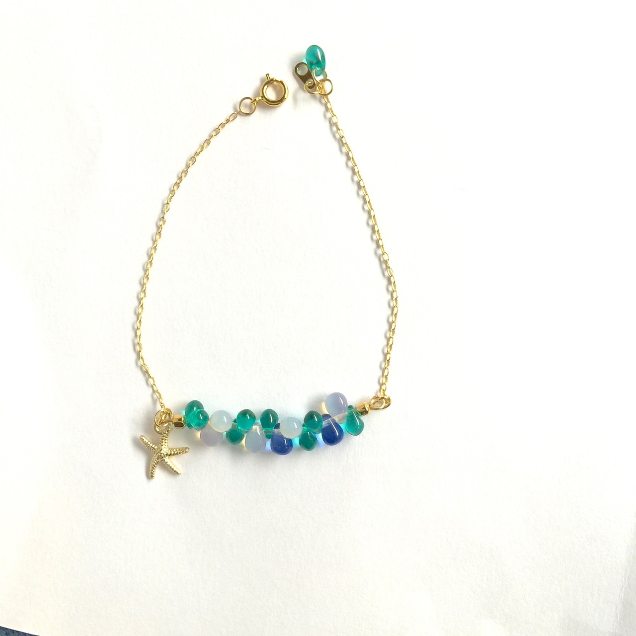 小さなゴールドのスターフィッシュとゴールドカラーの細いチェーン海色ビーズを引き立て、透明感と存在感があります。