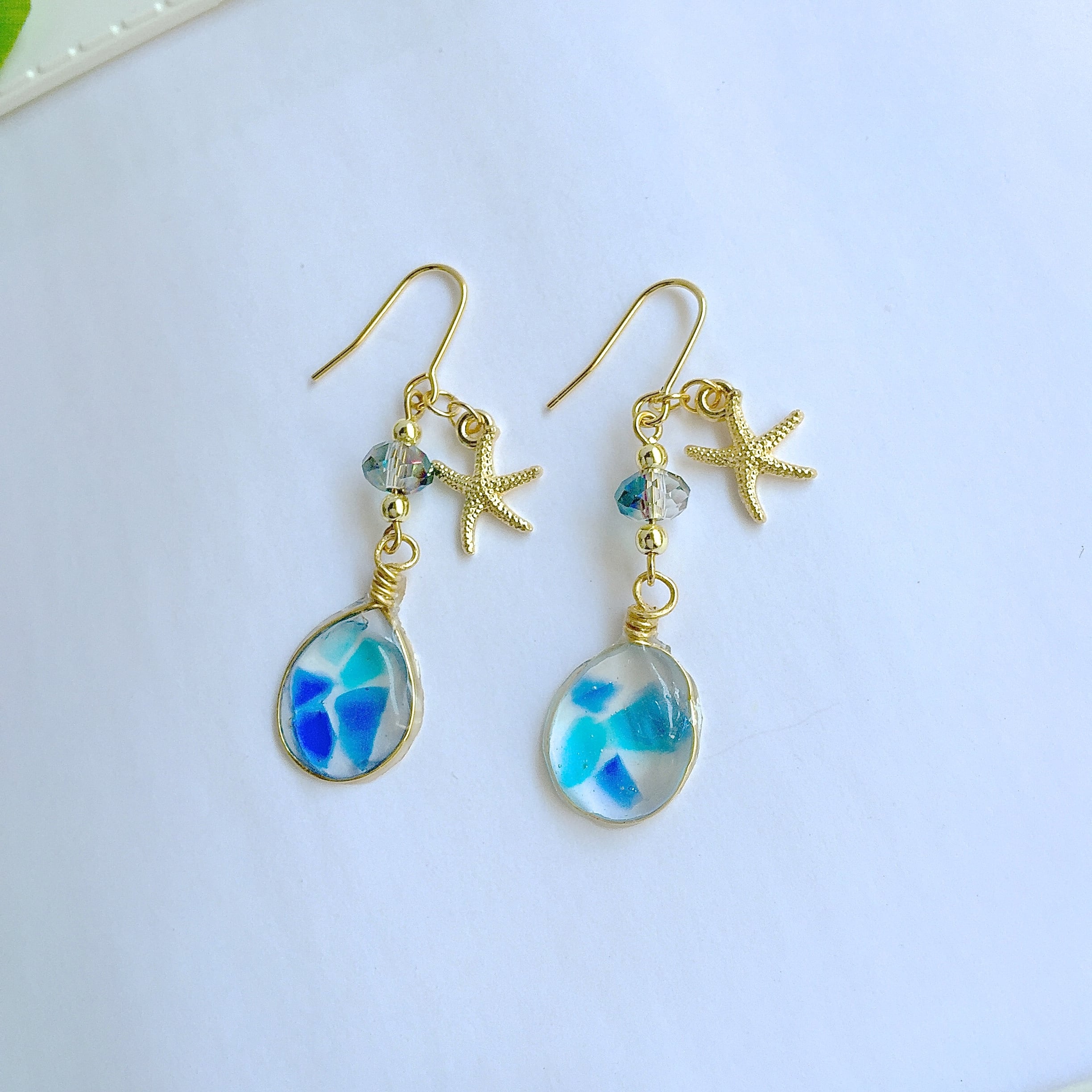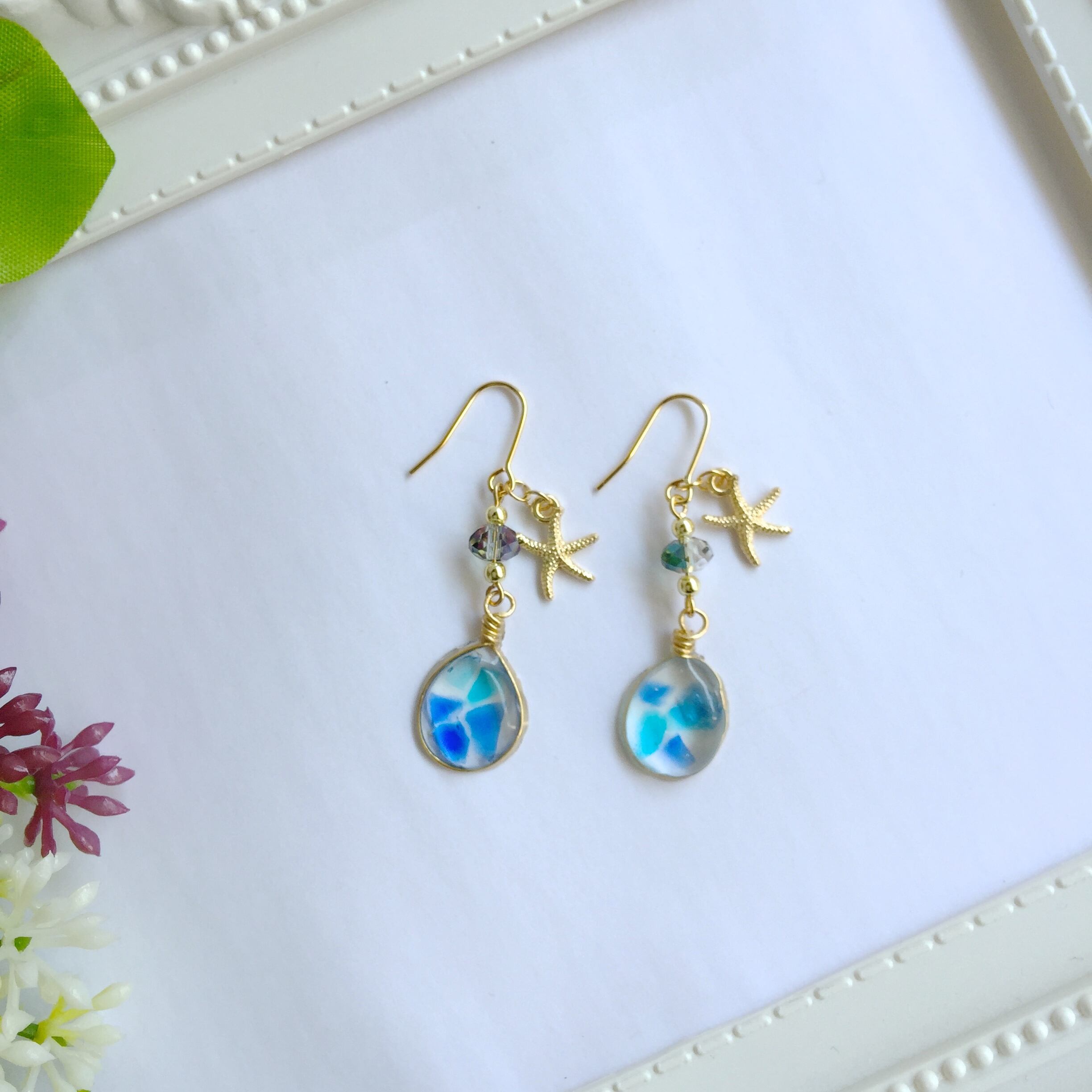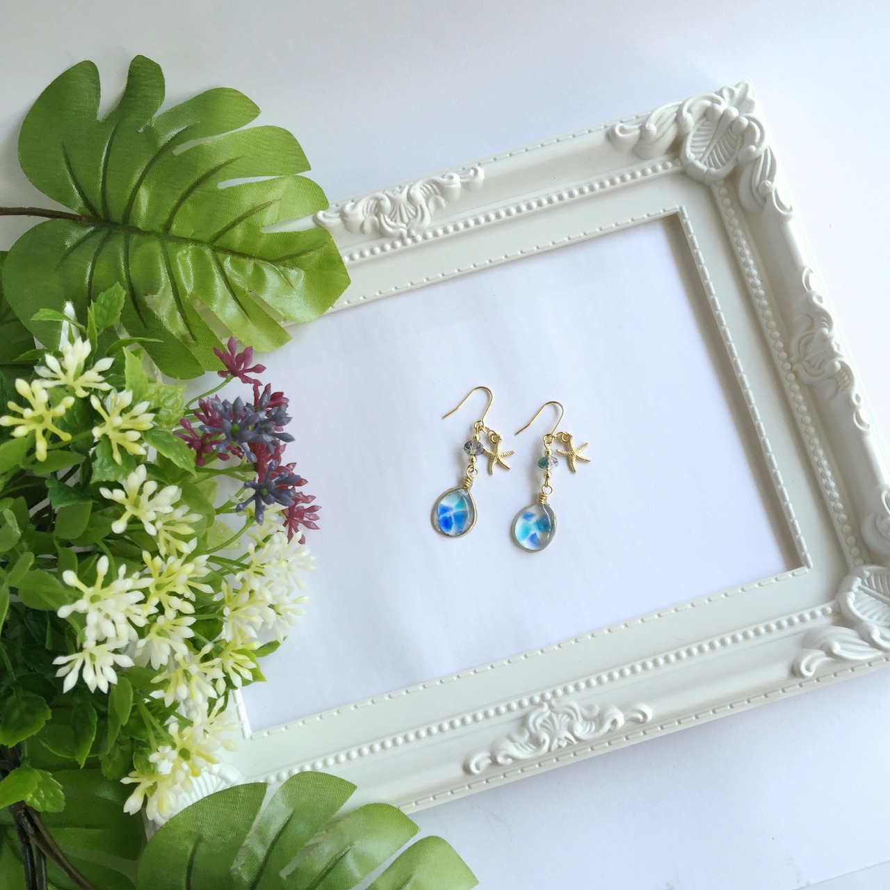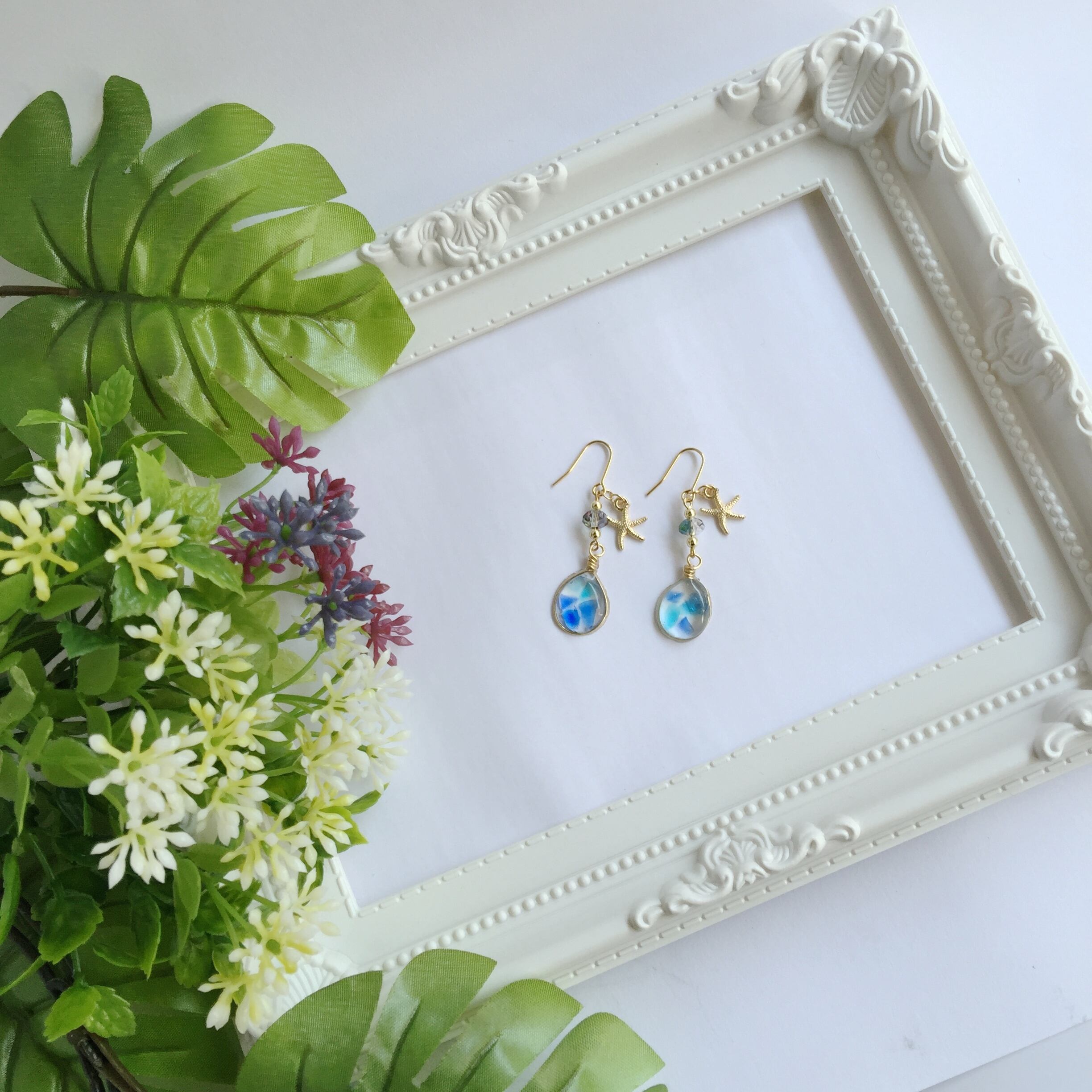 シンプルに様々なブルーで輝くビーズとゴールドカラーのスターフィッシュモチーフをゴールドカラーのフックピアスにあしらい爽やかな印象に仕上げました。