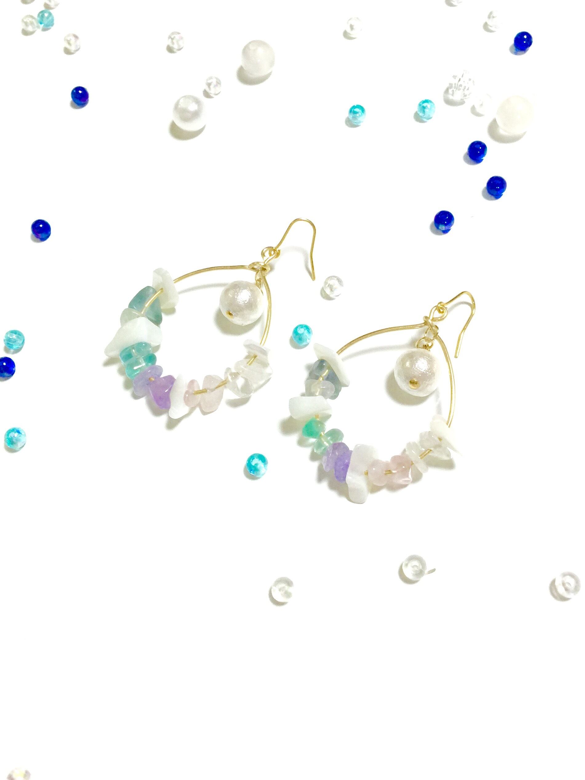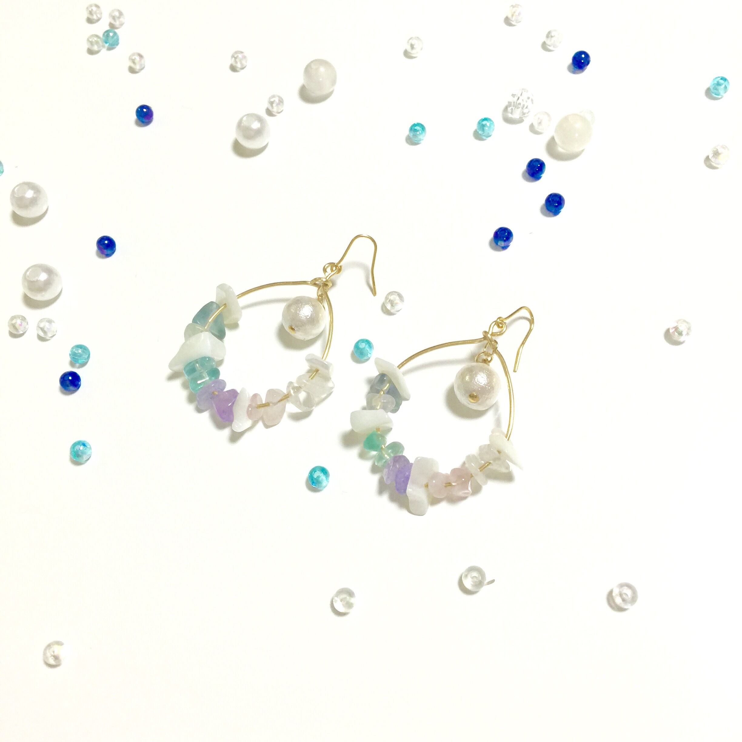 これからのシーズンにぴったりの柔らかな色合いの天然石とマザーオブパールをを金色のフープピアスにあしらいました。