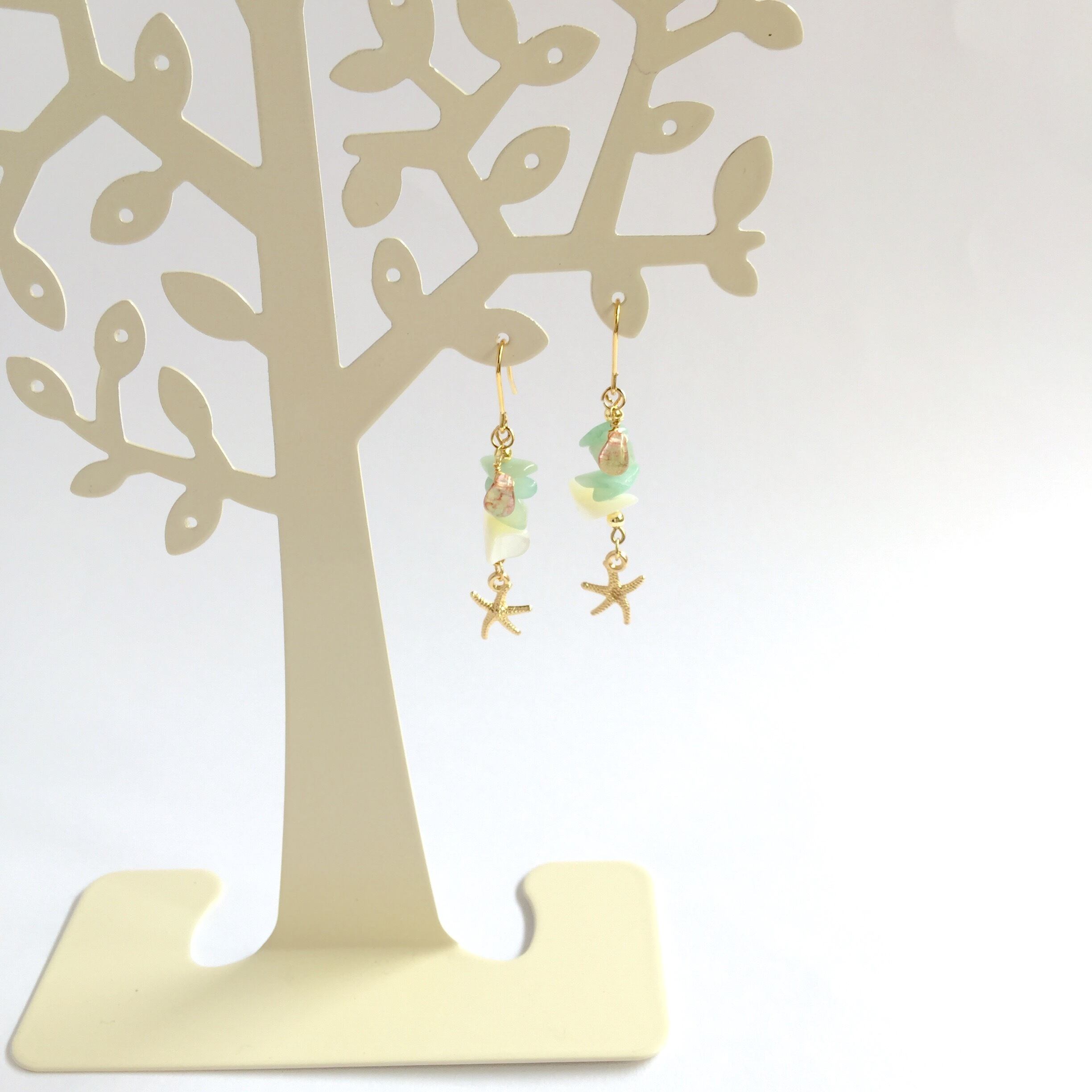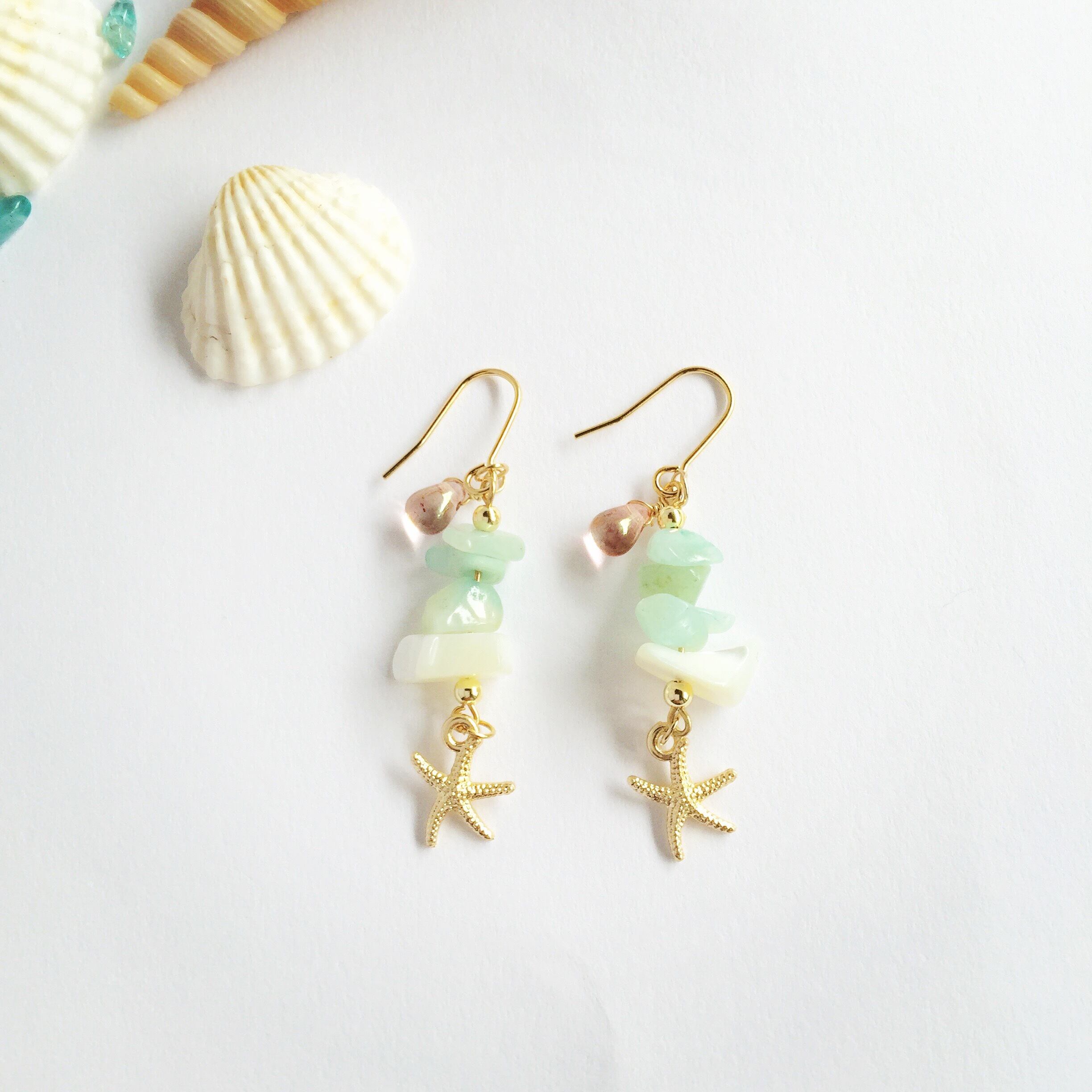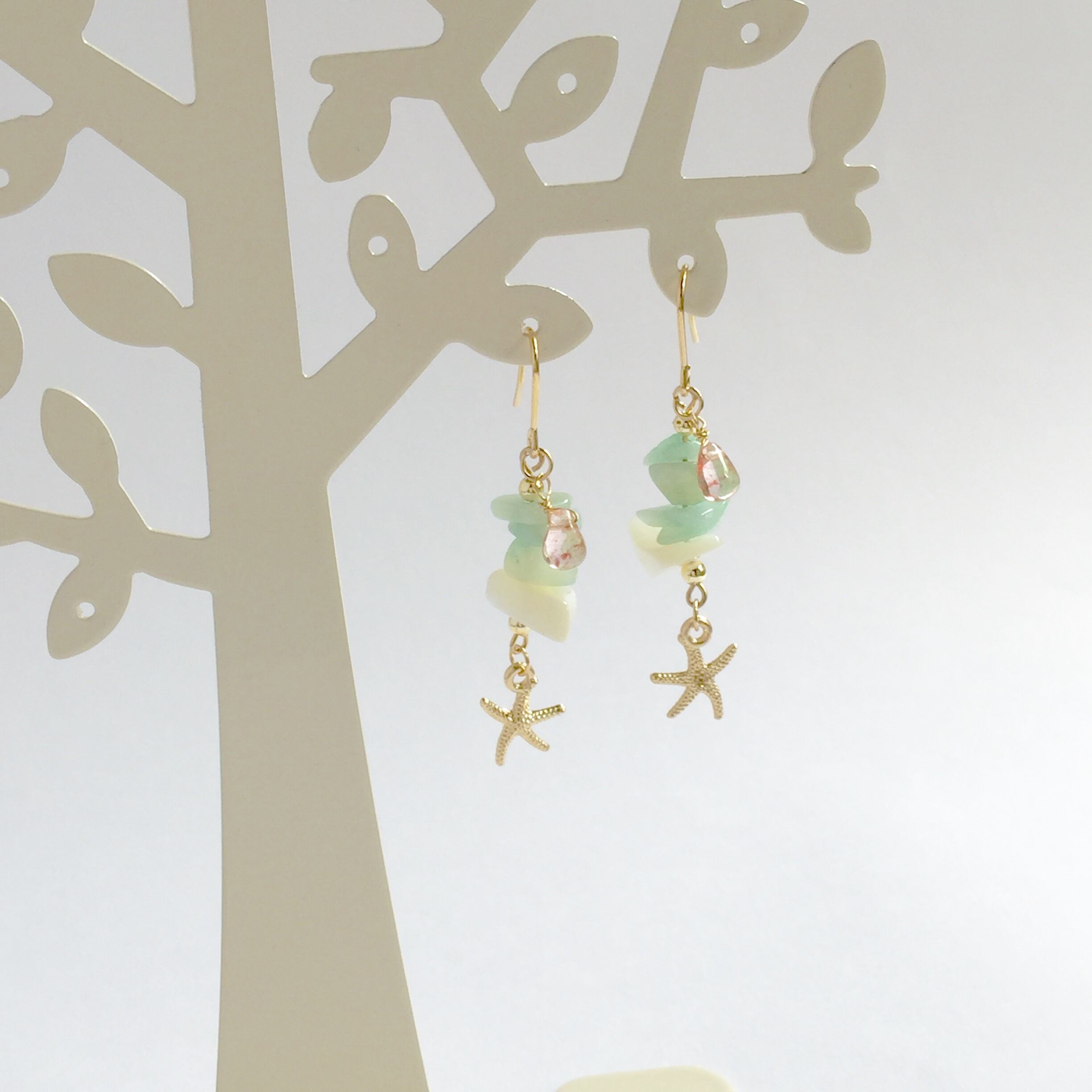 淡いブルーグリーンが爽やかな天然石アマゾナイトと虹色の輝きが柔らかなマザーオブパールにゴールドカラーのスターフィッシュをあしらい、フックピアスにしました。