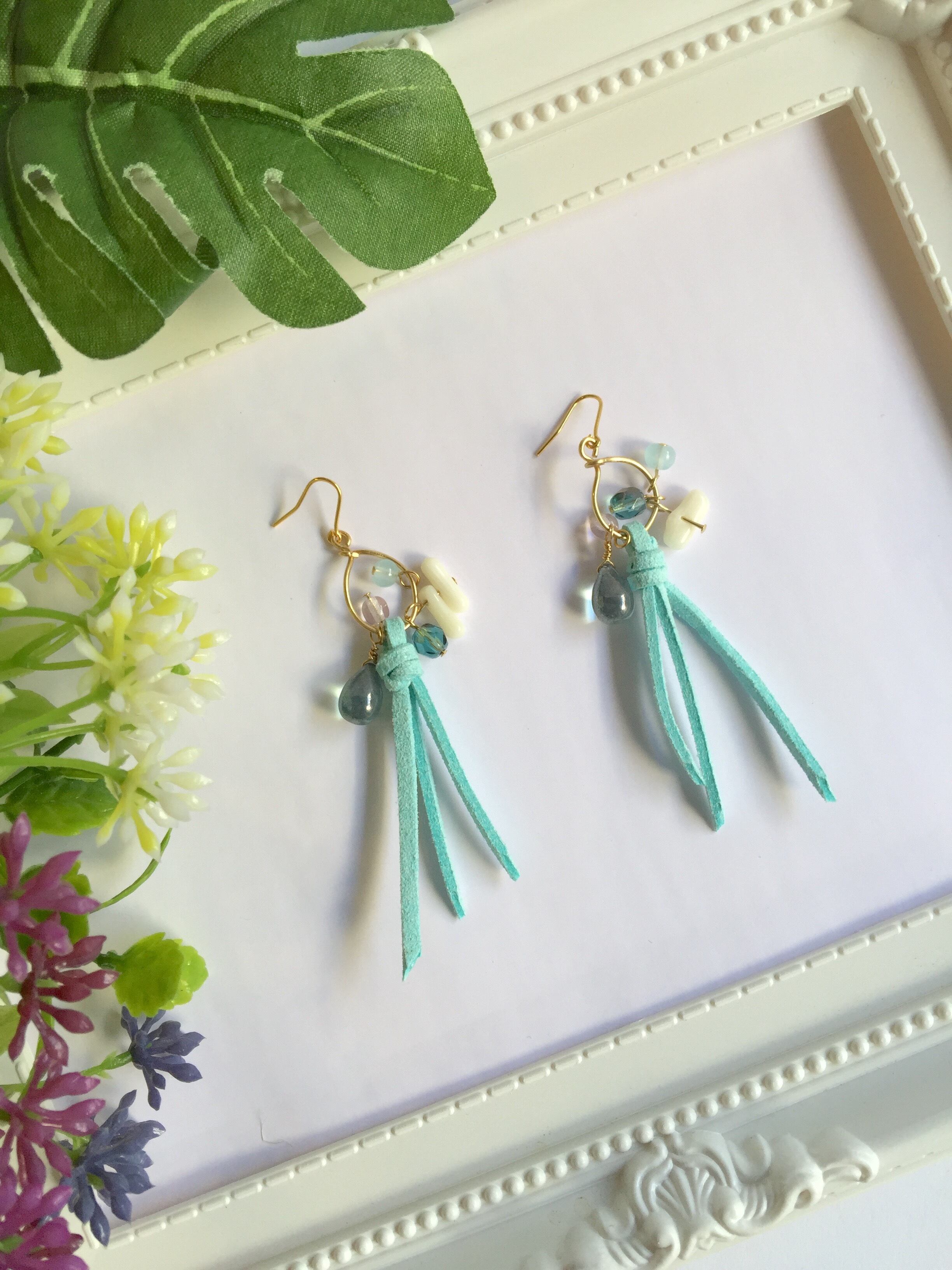 ティファニーブルーの様なカラーのスエード調コードをタッセルにしてゴールドカラーフックピアスにしました。