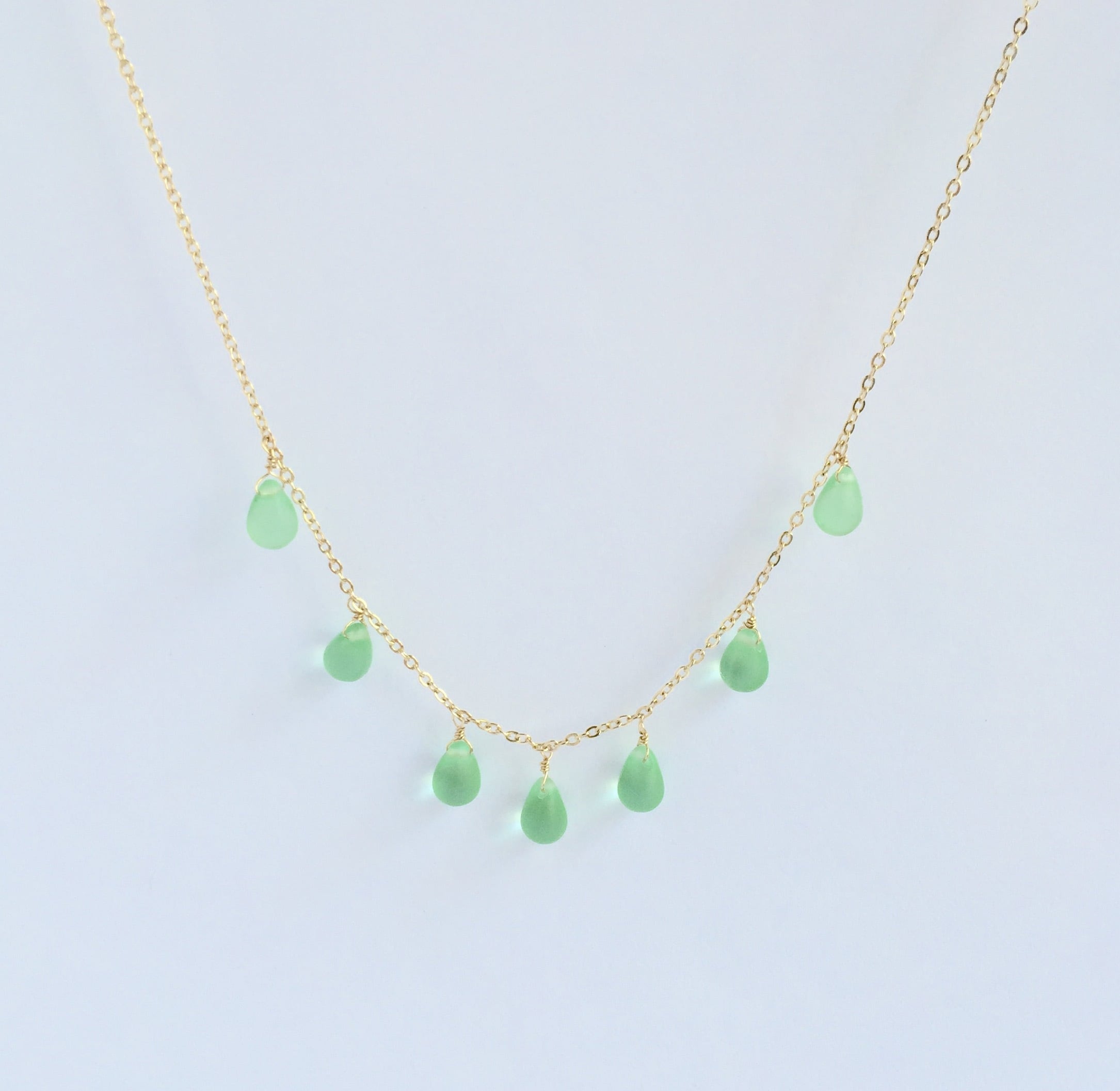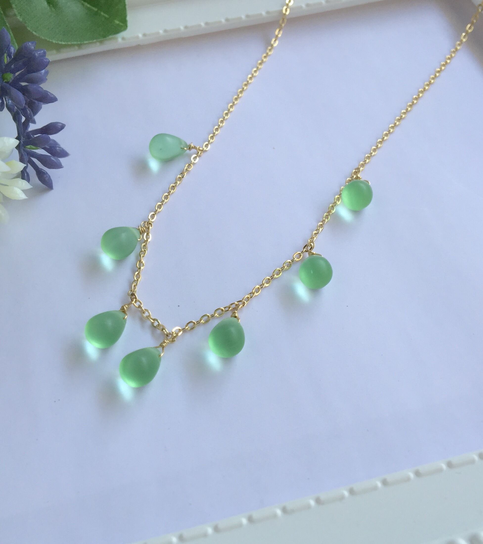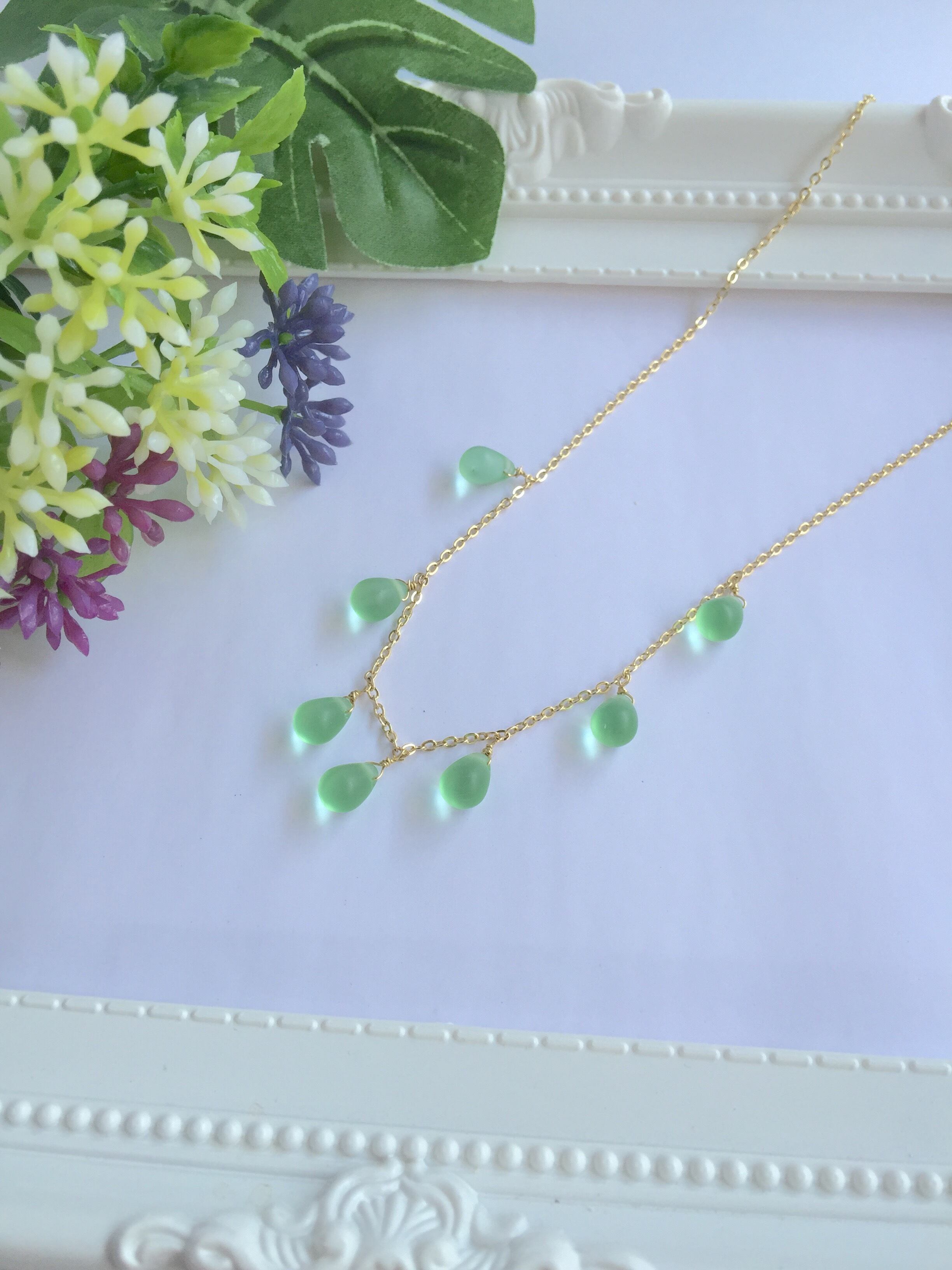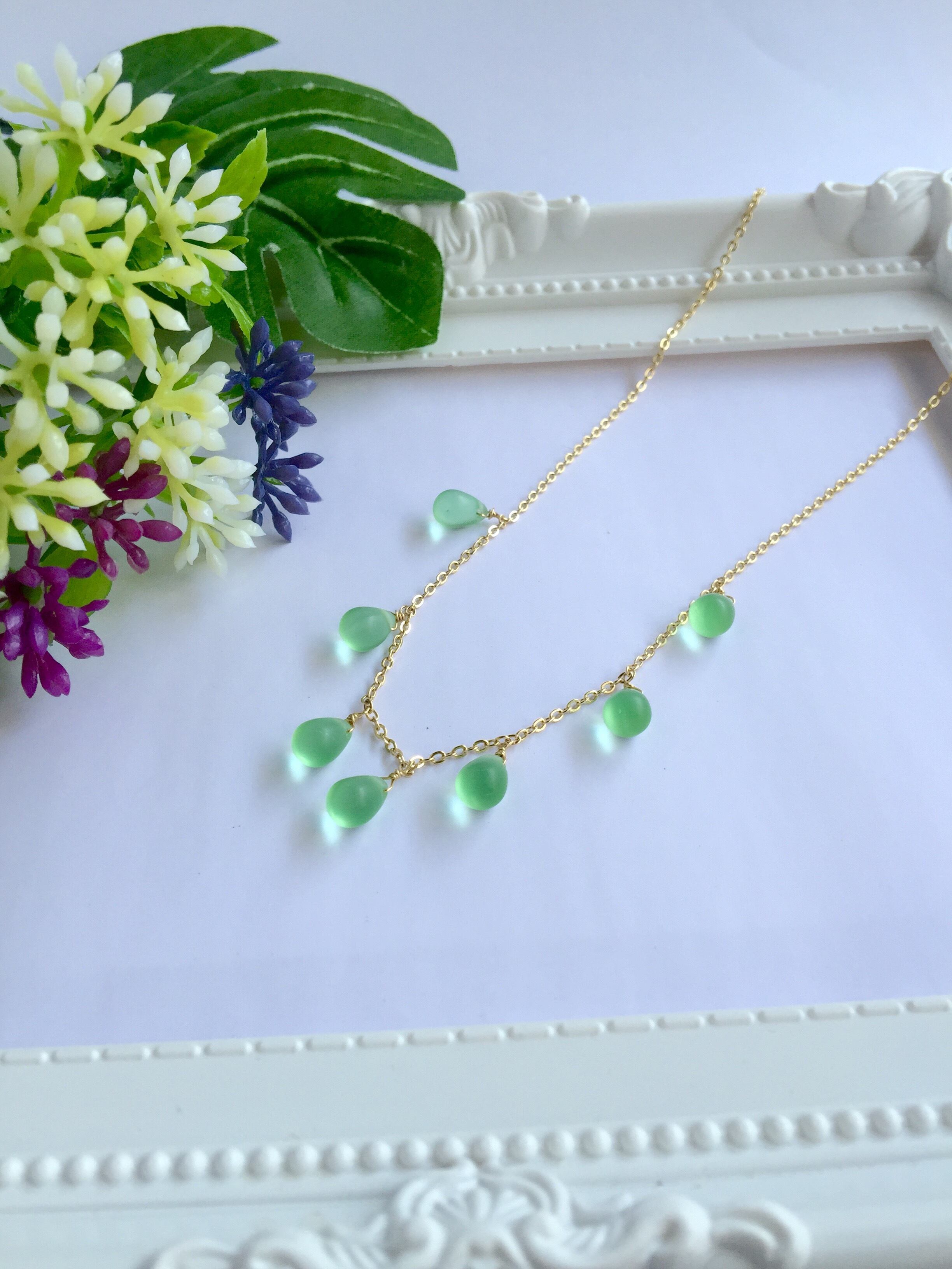 胸元でコロンとした淡いグリーンのティアドロップビーズが揺れて輝きます。ツヤ消しのビーズは透明のものと違って、シーガラスのようなニュアンスのある輝きが魅力です。