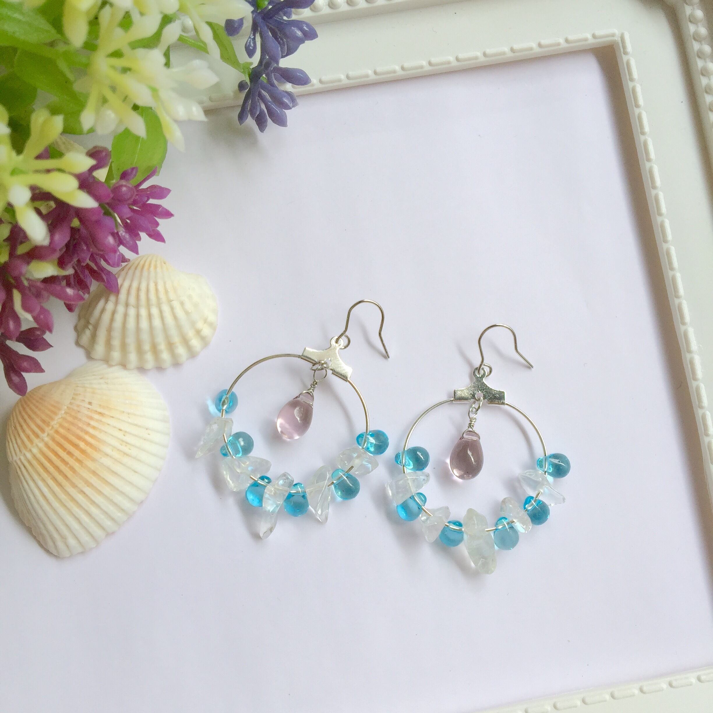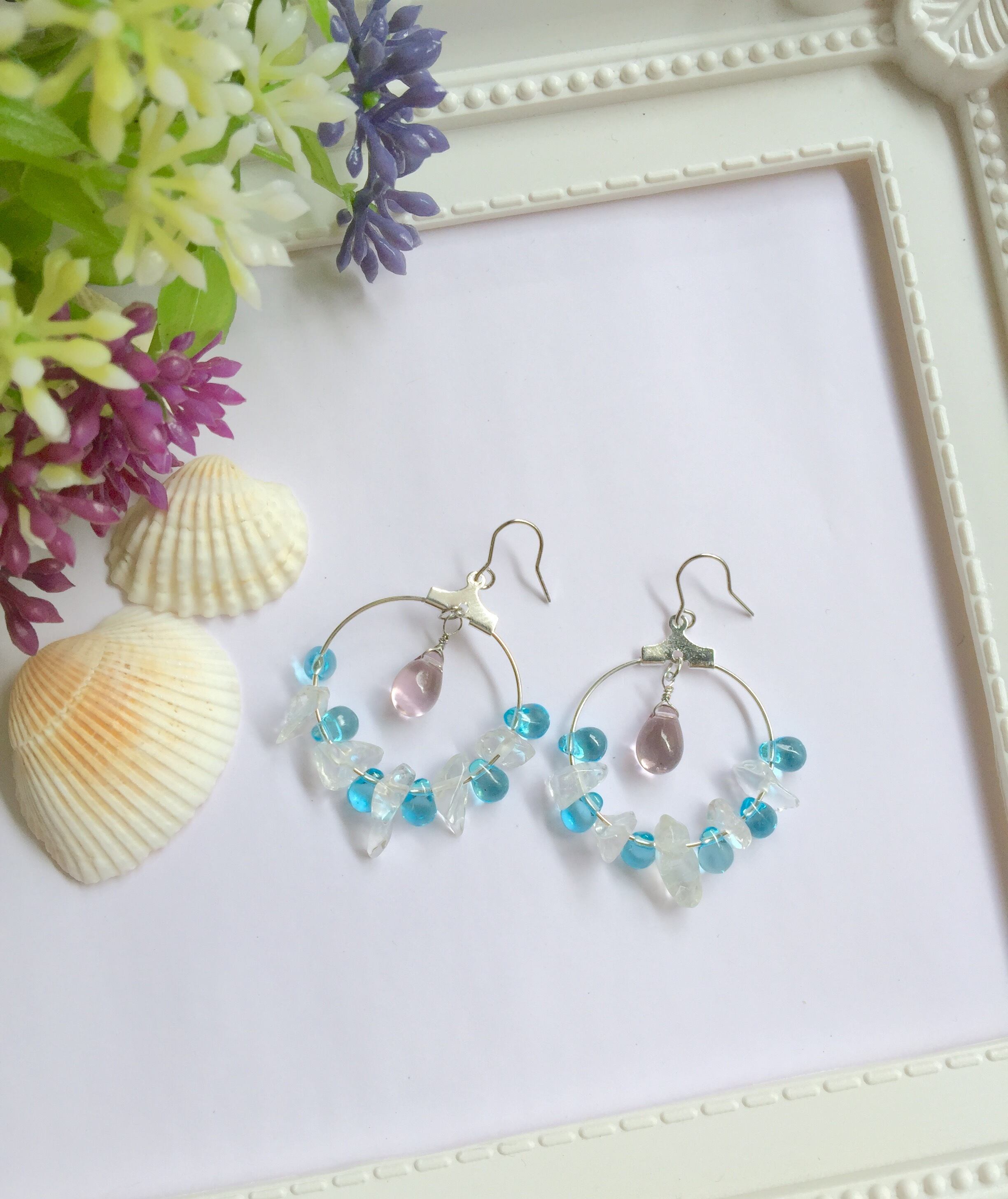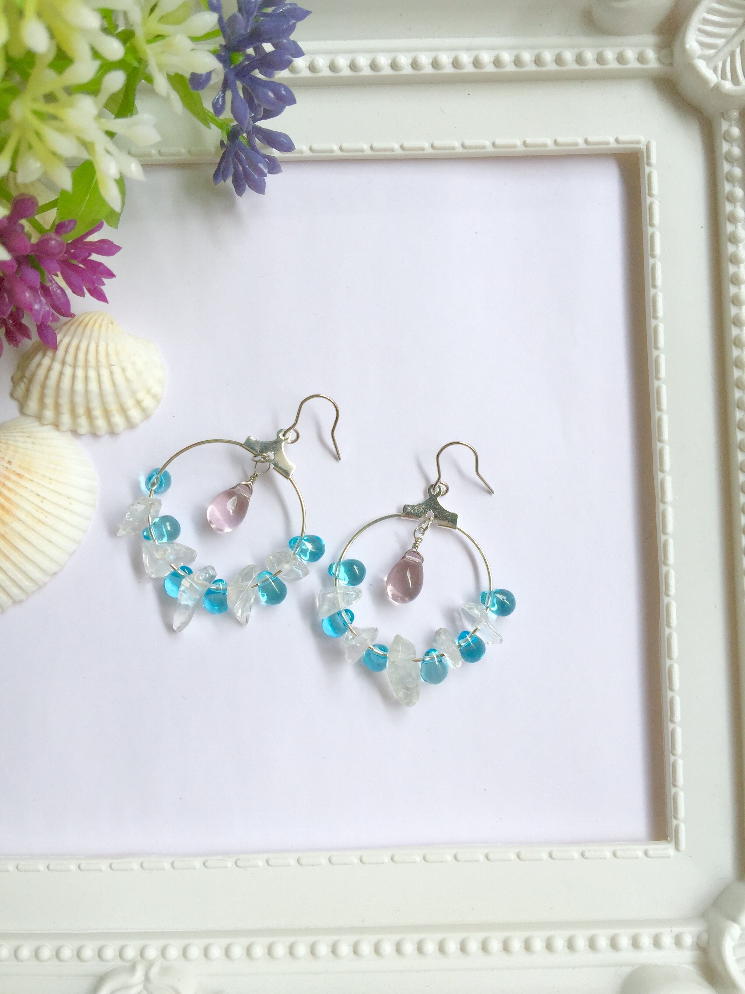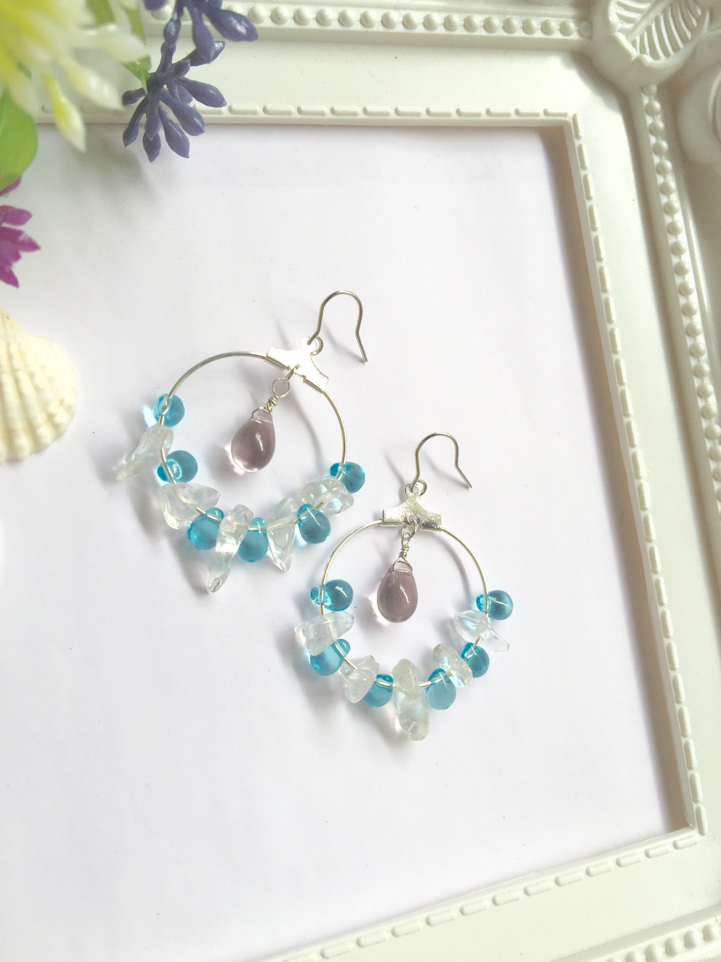 アクアマリンカラーが美しいティアドロップビーズとかち割り氷のようなクリスタルをシルバーカラーフープピアスに交互あしらって清涼感たっぷりのピアスにしました。中央には少しおおきめのライトアメジストのチェコビーズを添えました。