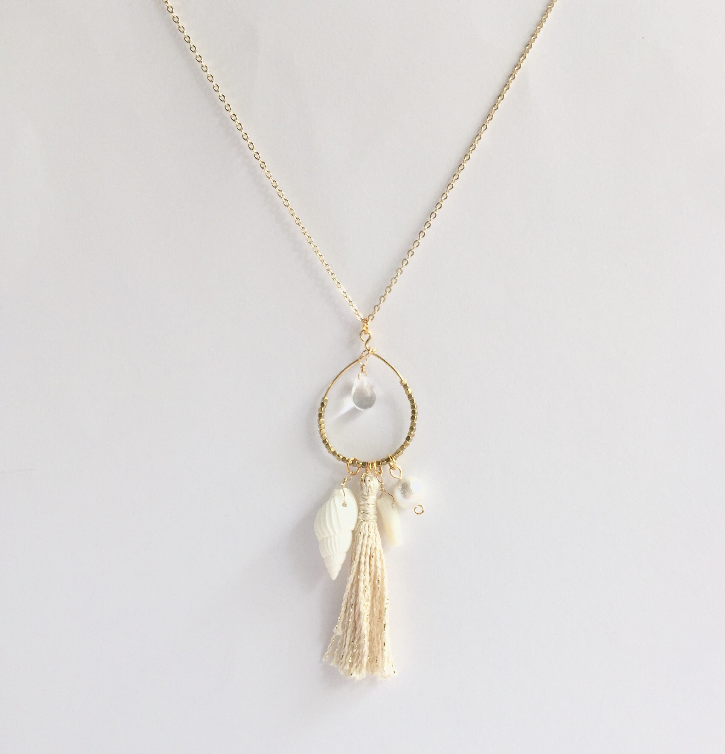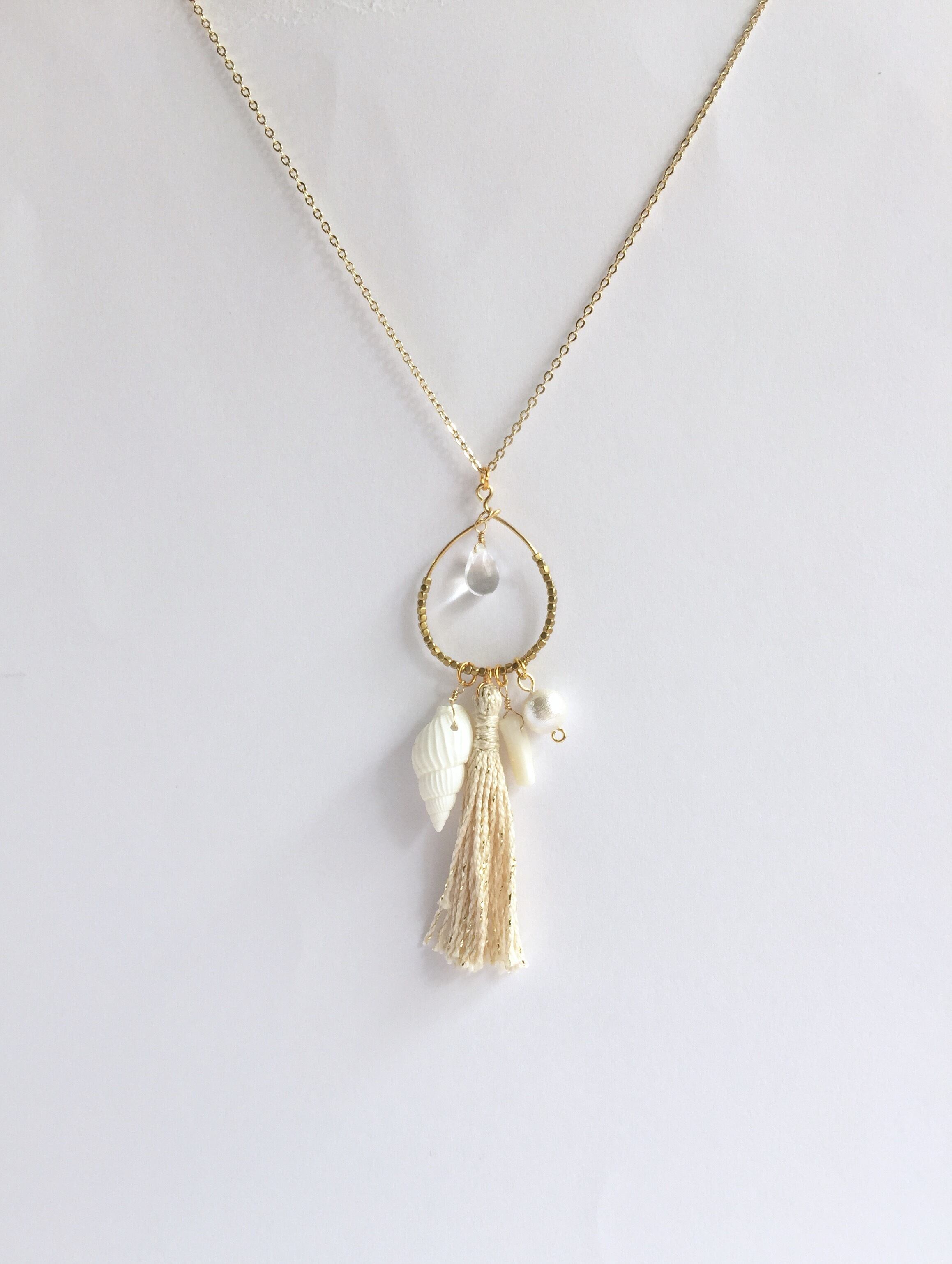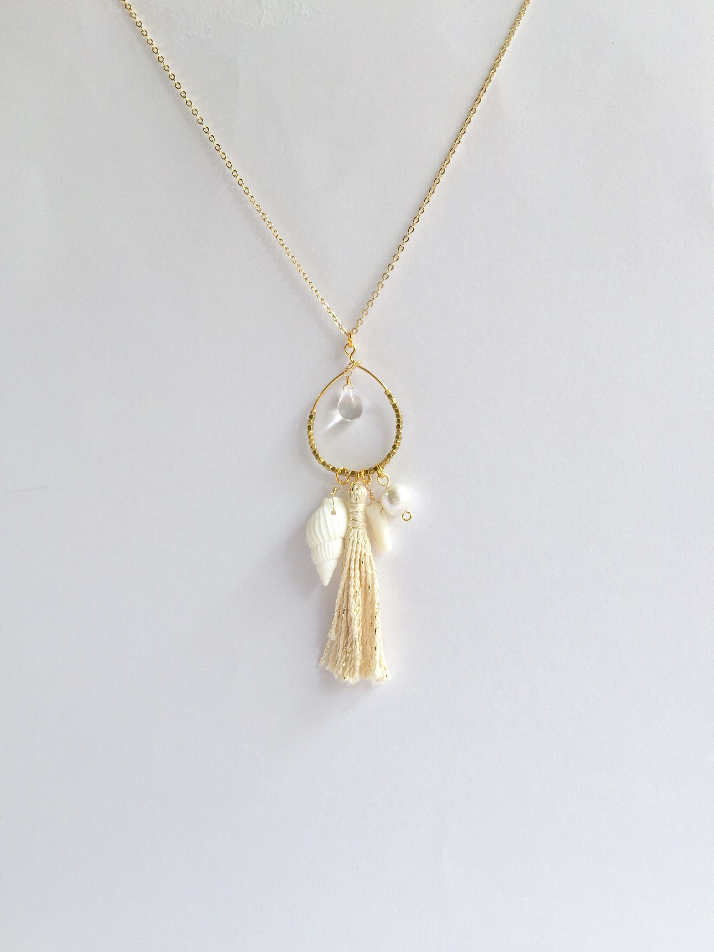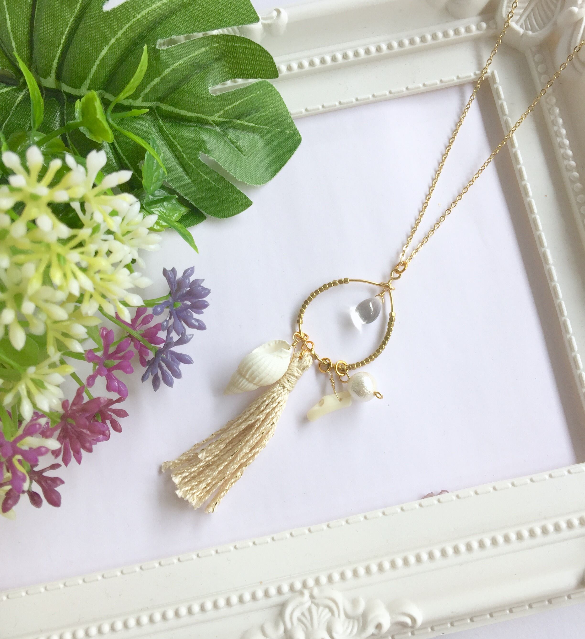 ゴールドカラーのチェーンの先のフープに、ゴールドのラメが光るタッセルと、真っ白な巻貝、コーラル、コットンパールとクリアなティアドロップチェコビーズをあしらいました。