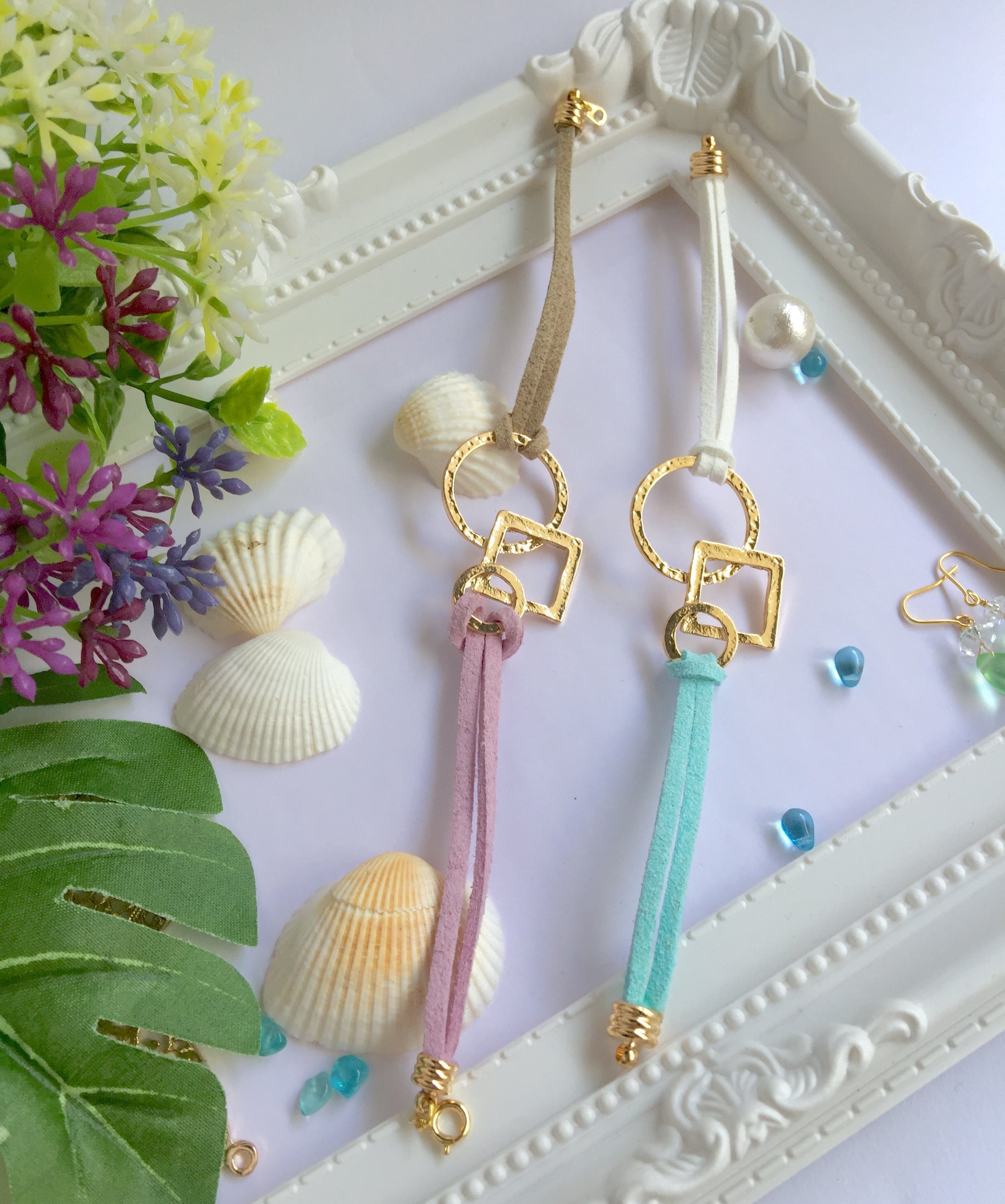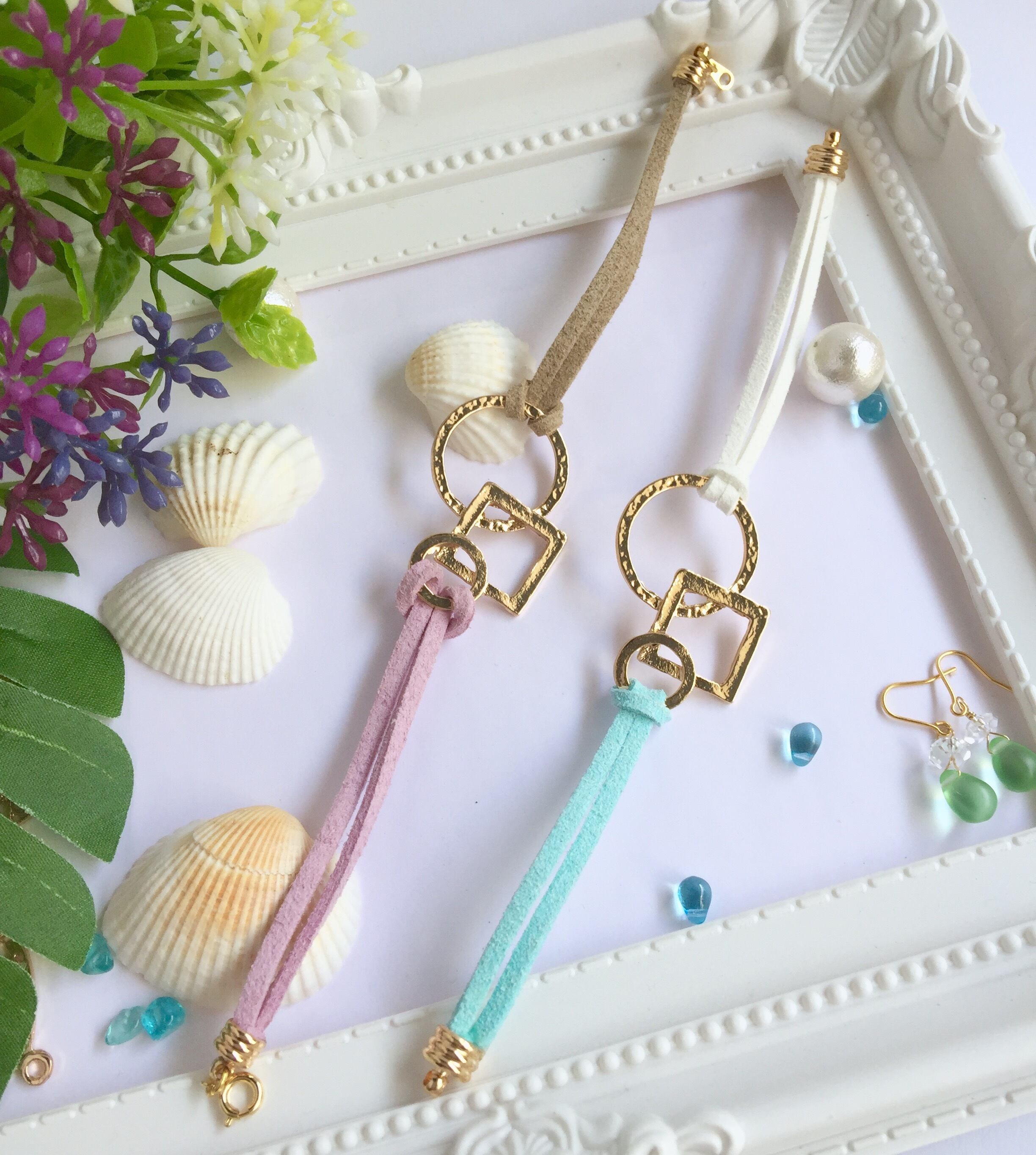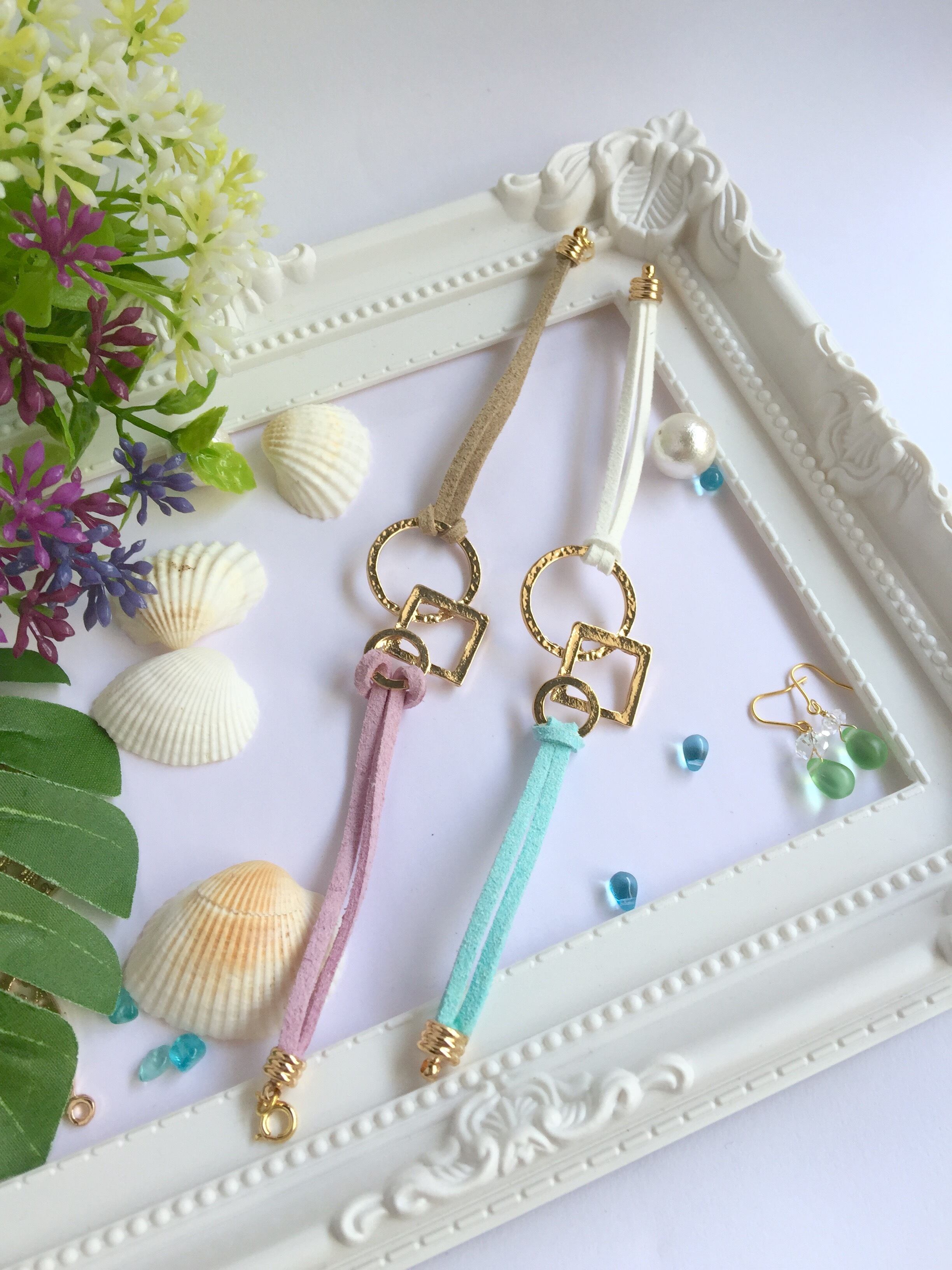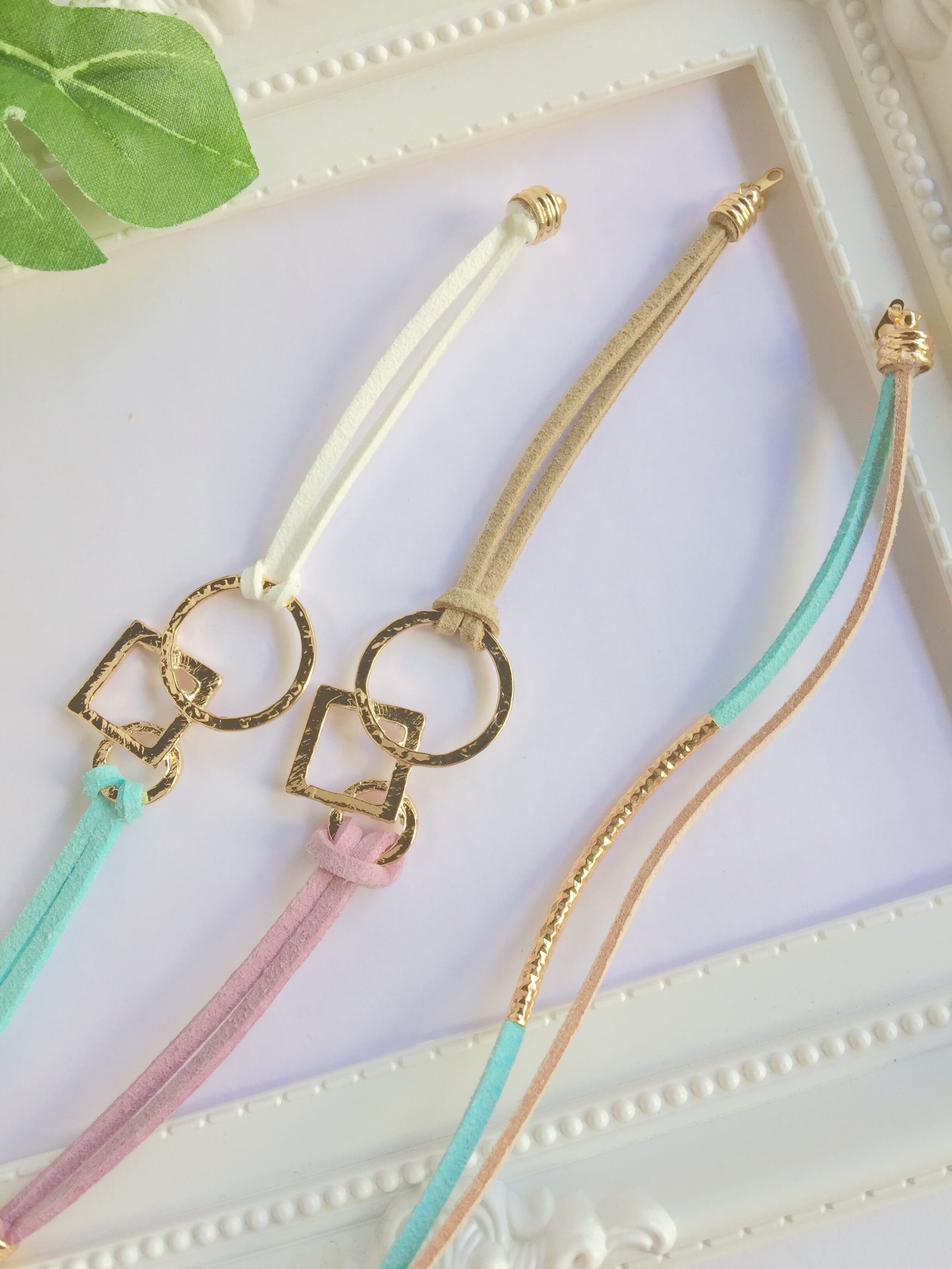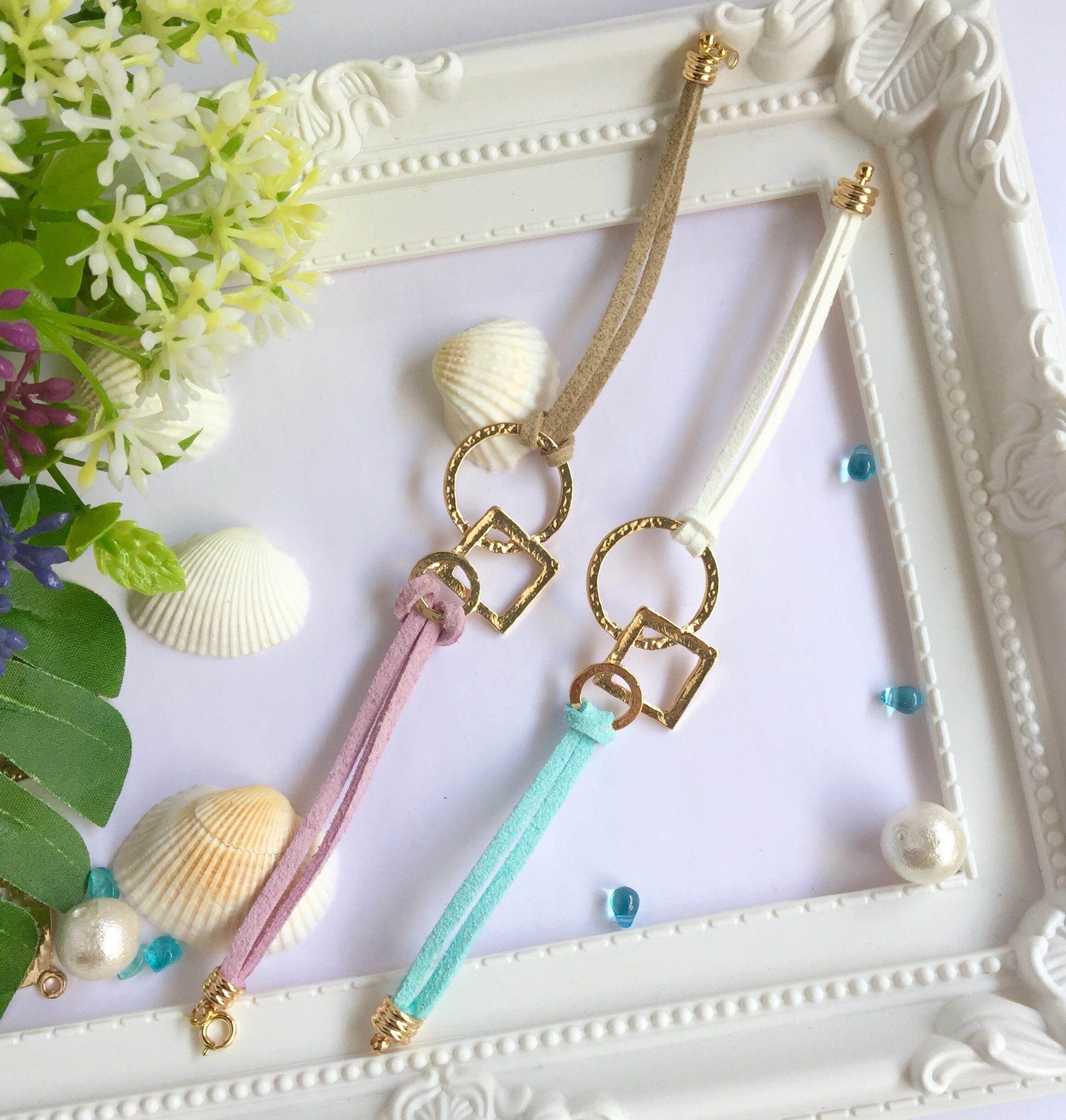 ゴールドカラーの幾何学チャームとカラフルなフェイクスウェードのブレスレットです。チャームはゴールド打ちでニュアンスのある輝きが楽しめます。