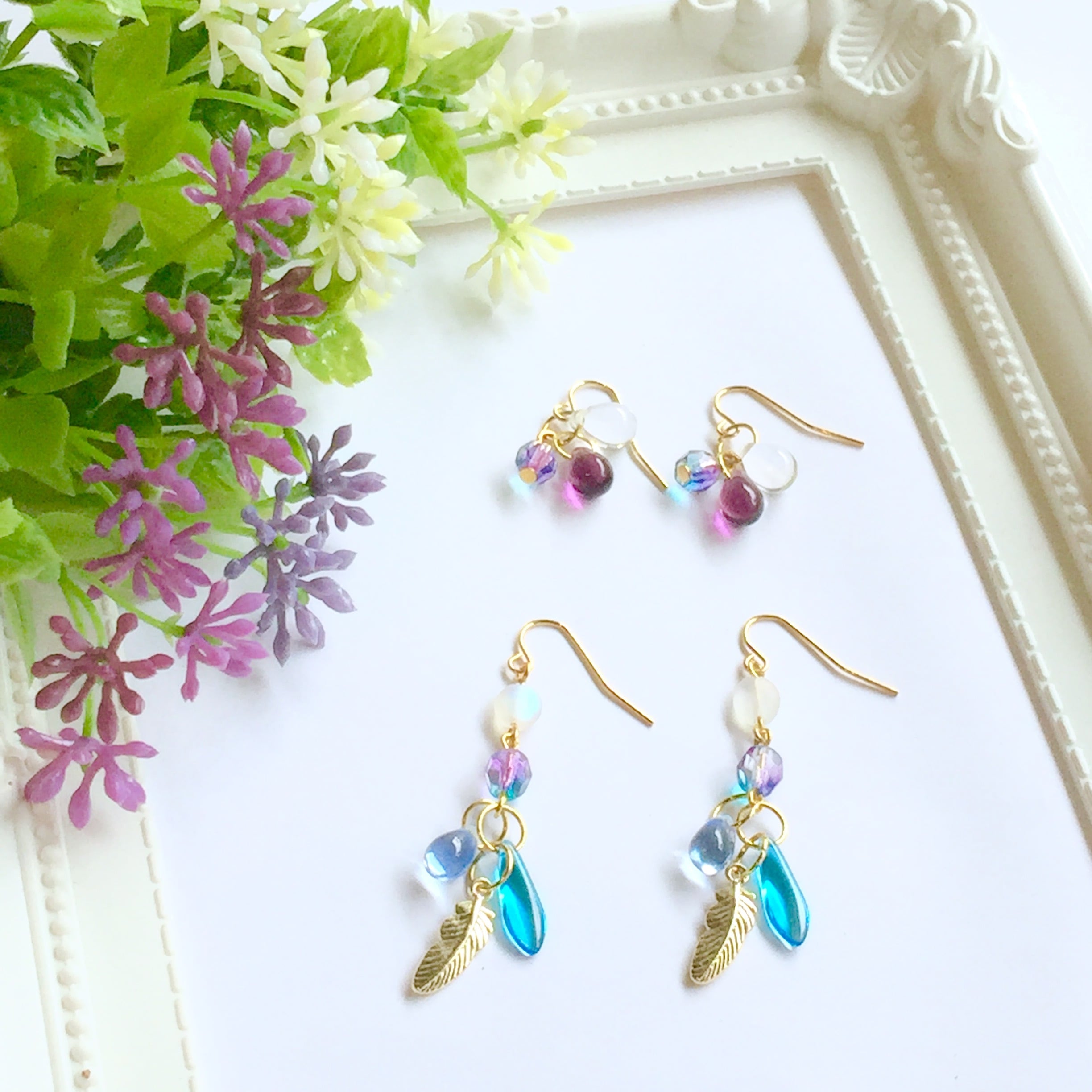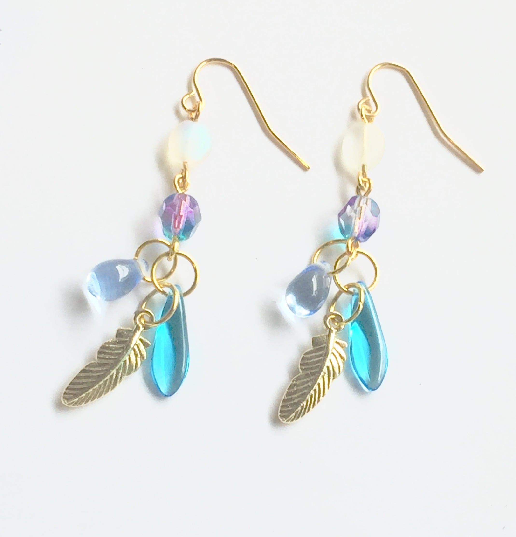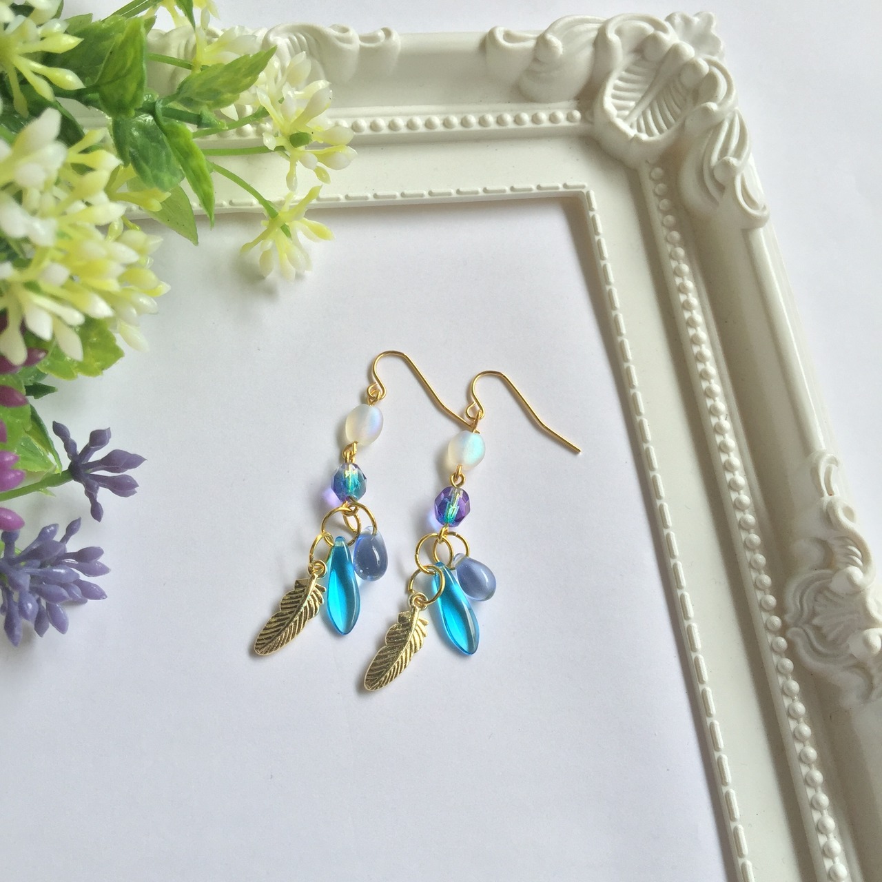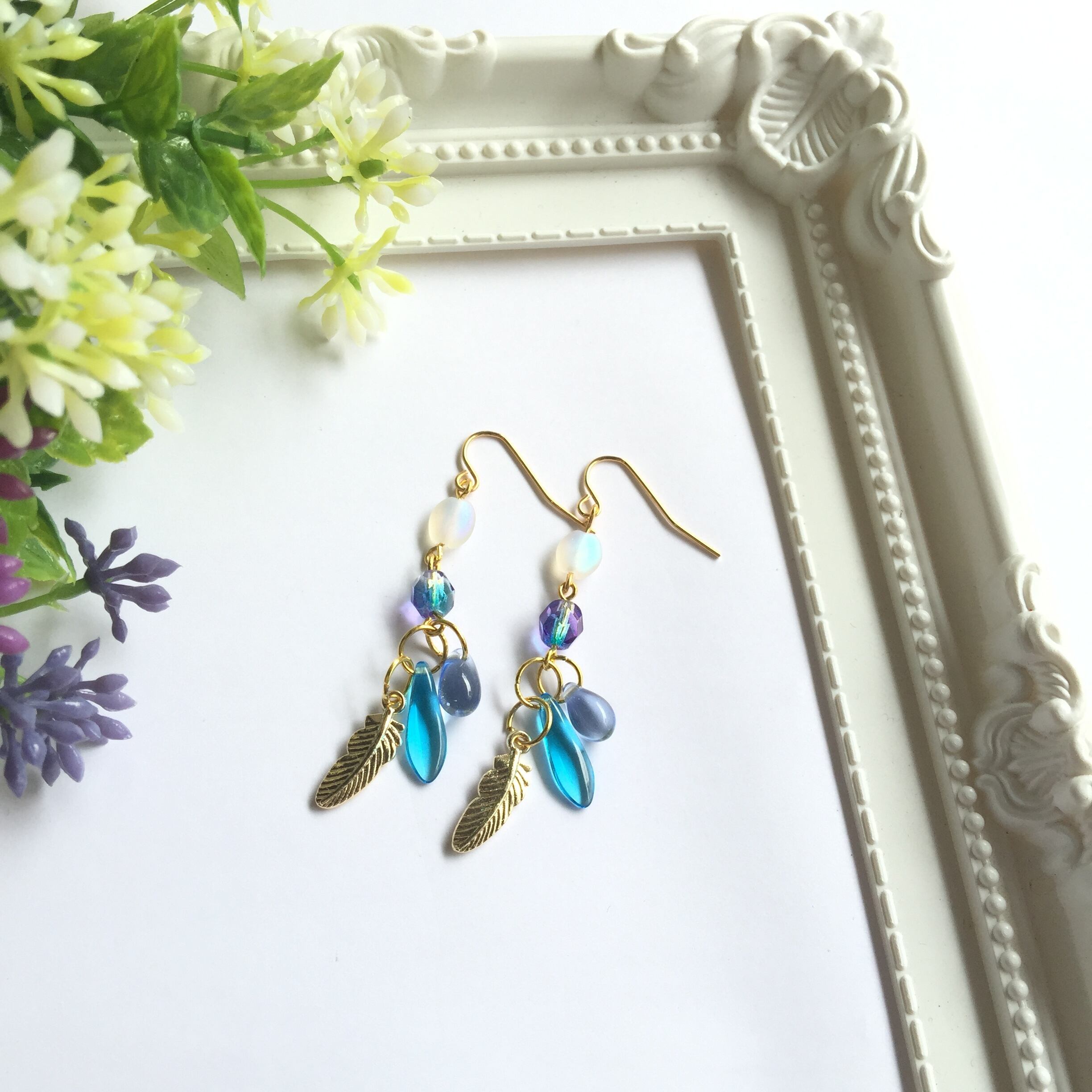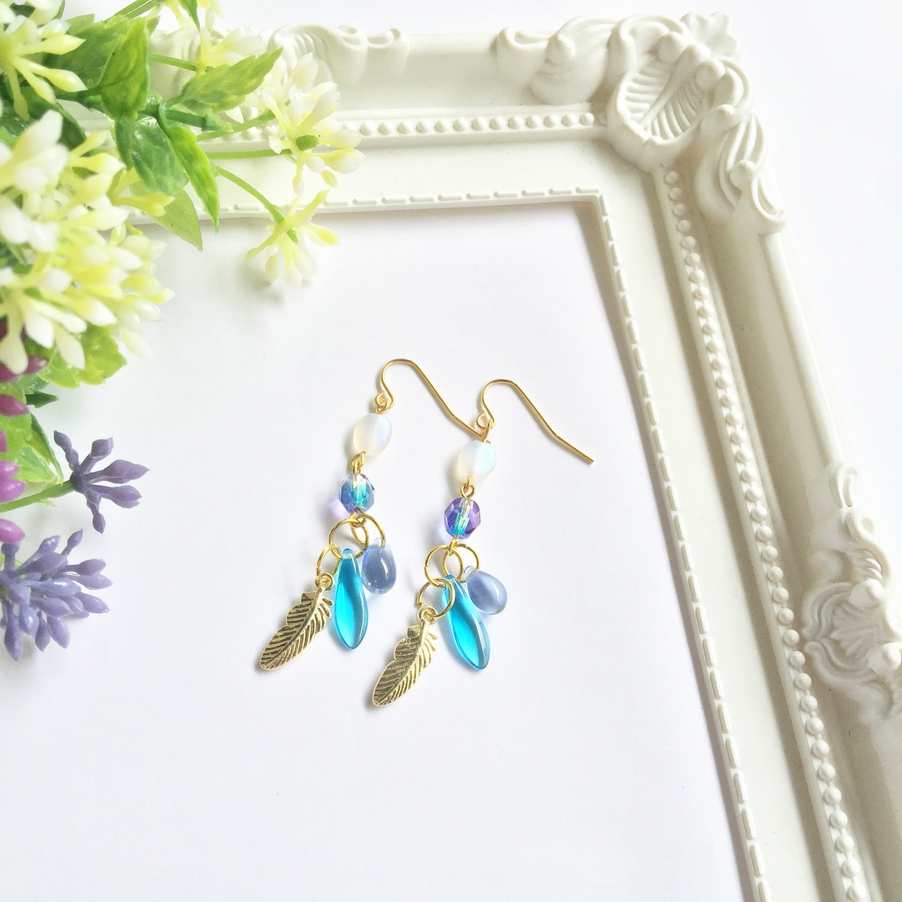 透き通るブルーが美しいカラーのティアドロップチェコビーズに、ニュアンスのあるブルーとパープルの相まったカラーのチェコビーズとゴールドカラーのフェザーチャームを添えて、シンプルなピアスにしました。